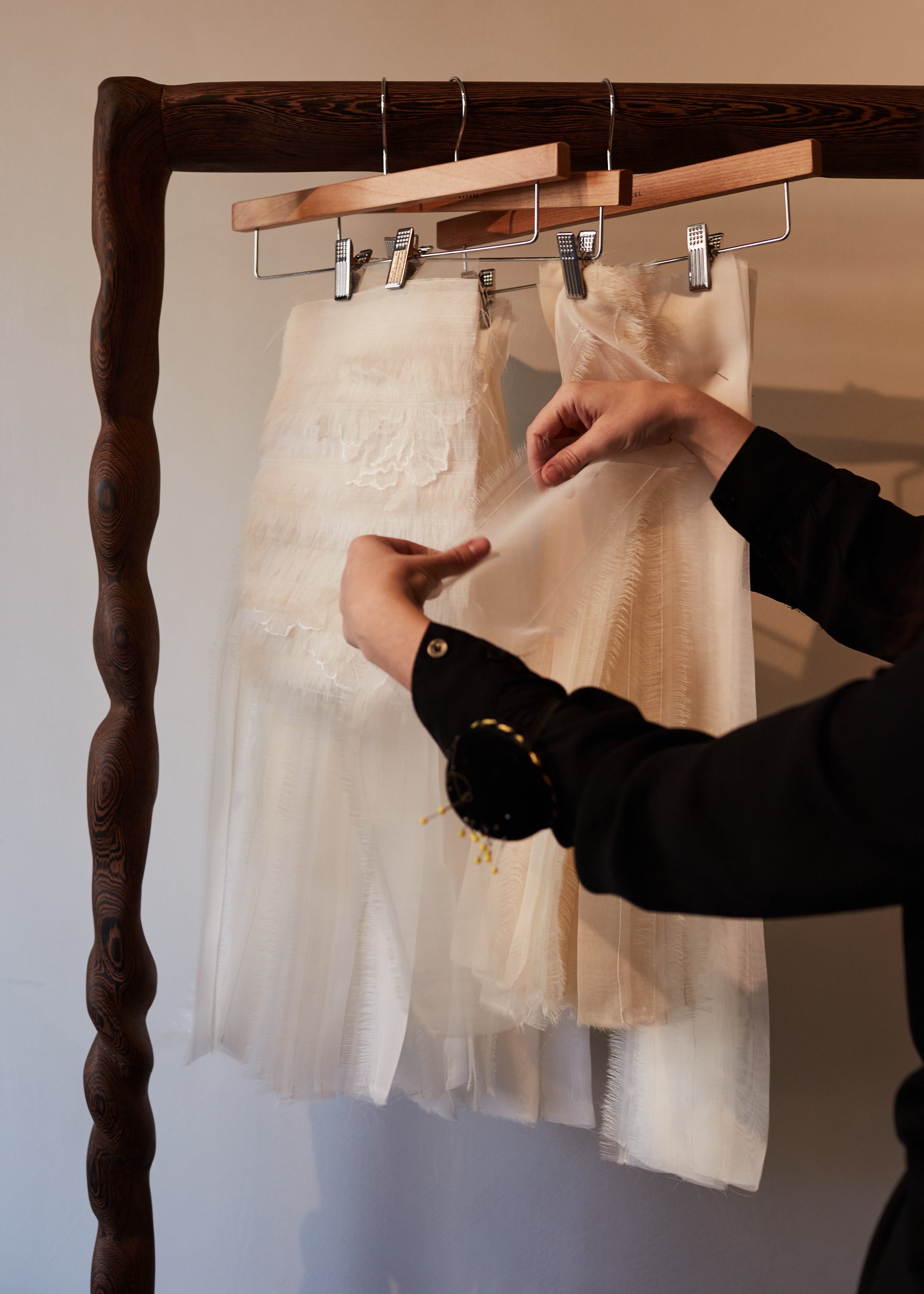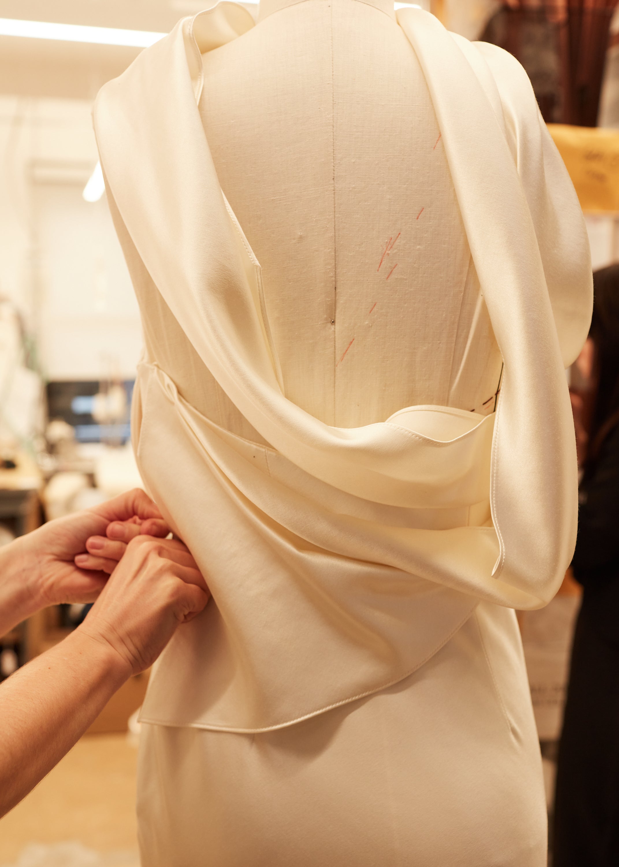 The client has their measurements taken at the New York Atelier or remotely depending on the clients location and a timeline is put in place for the first fitting. After this point in the process, the timelines and fittings vary depending on the gown design and complexity of the garment.