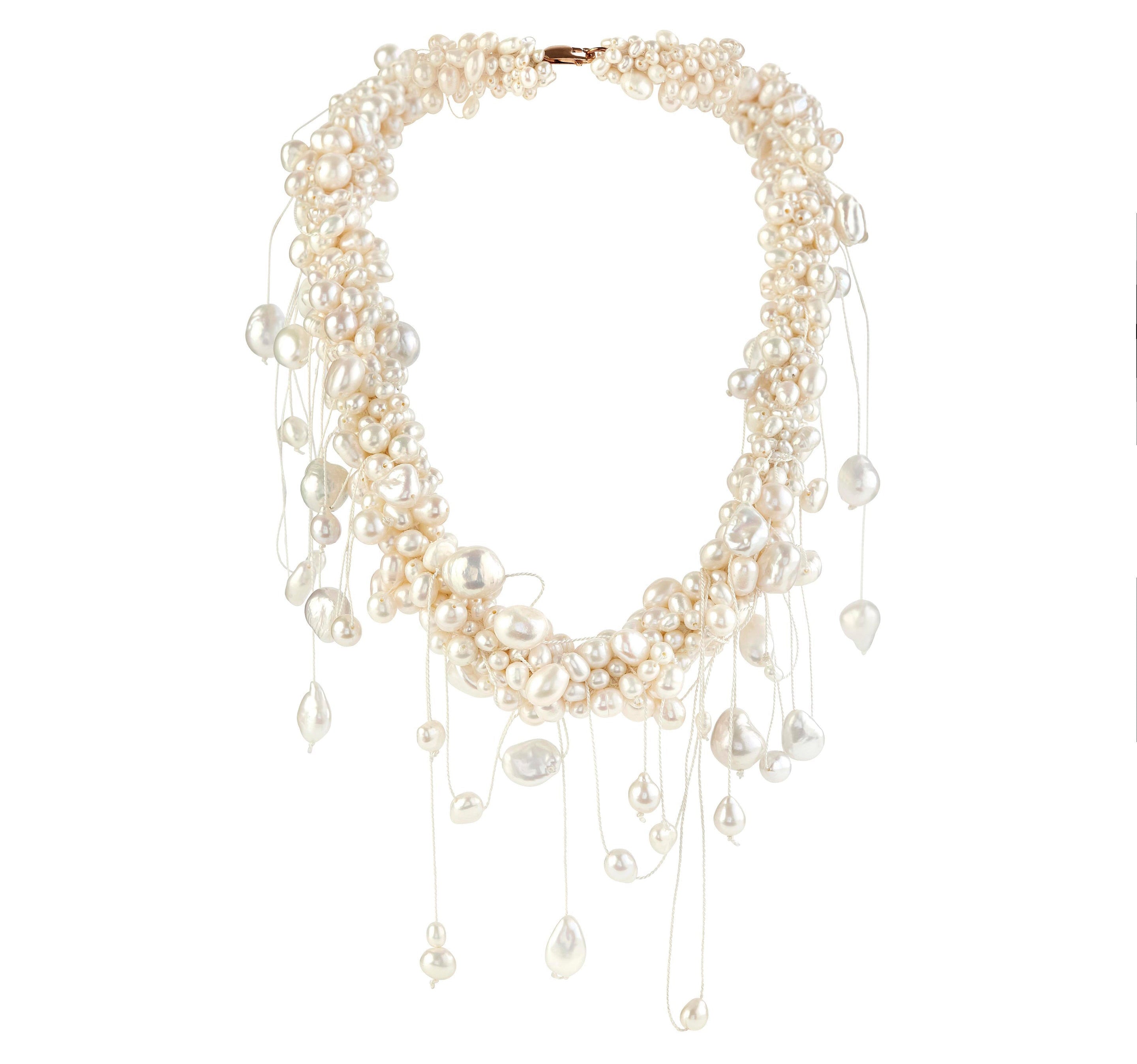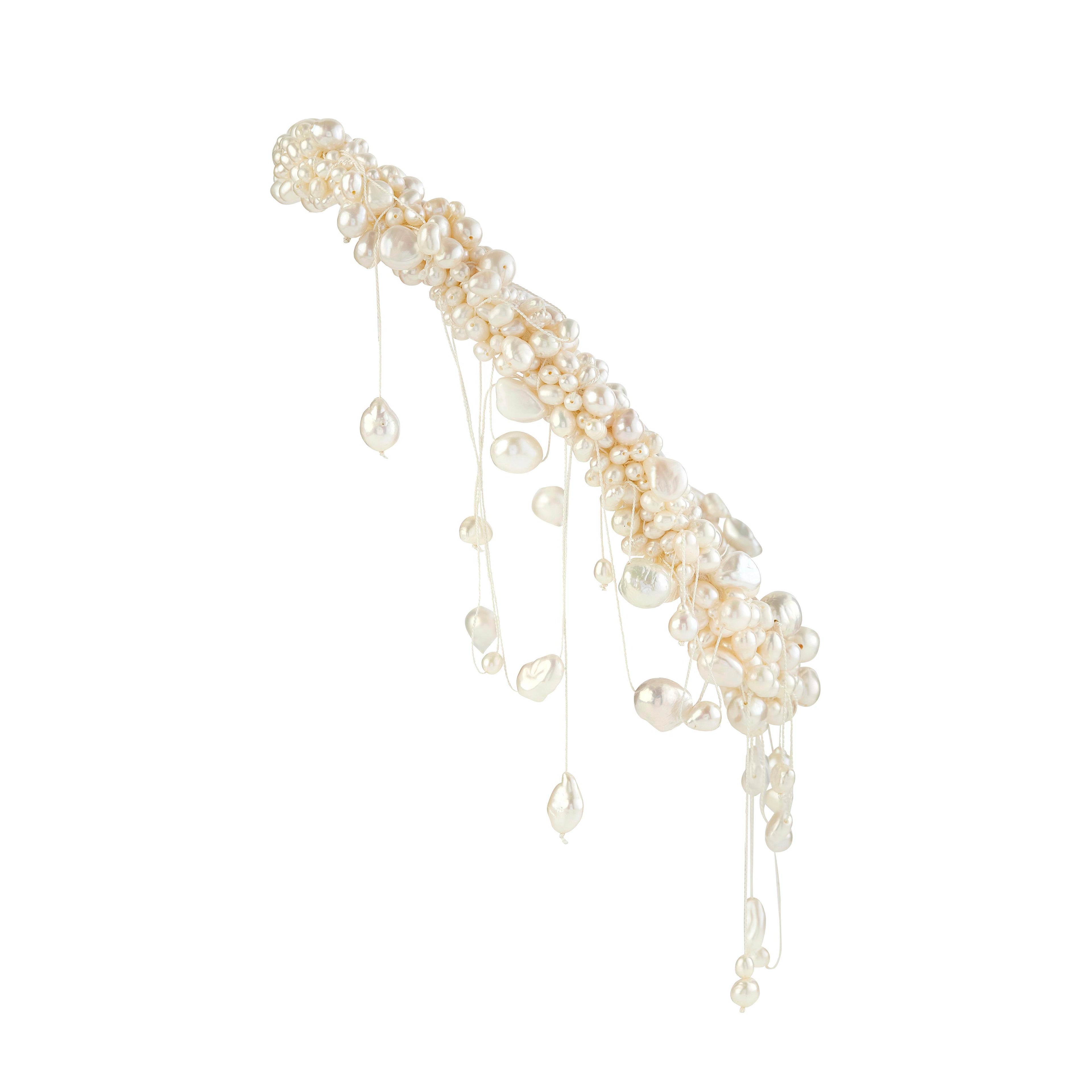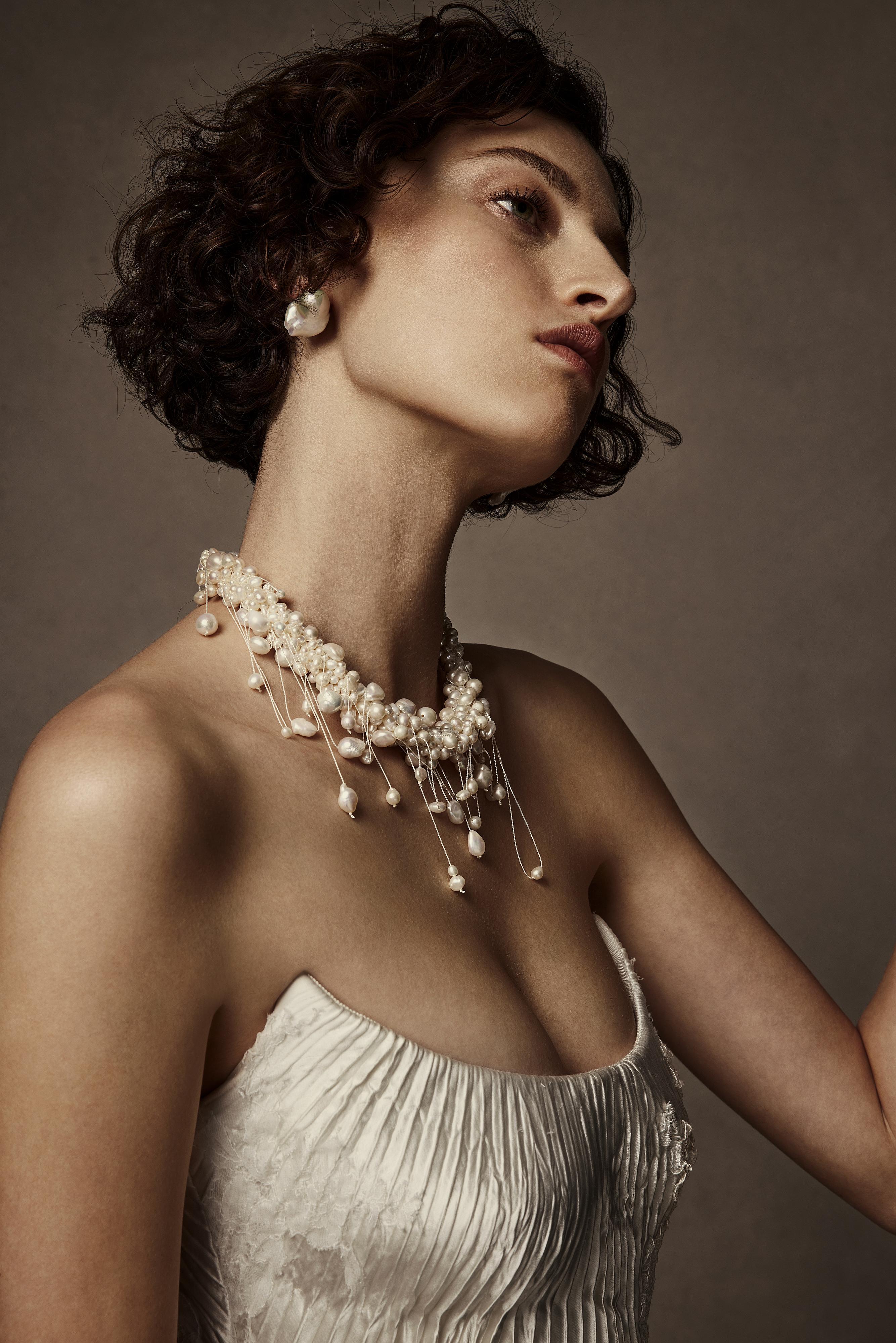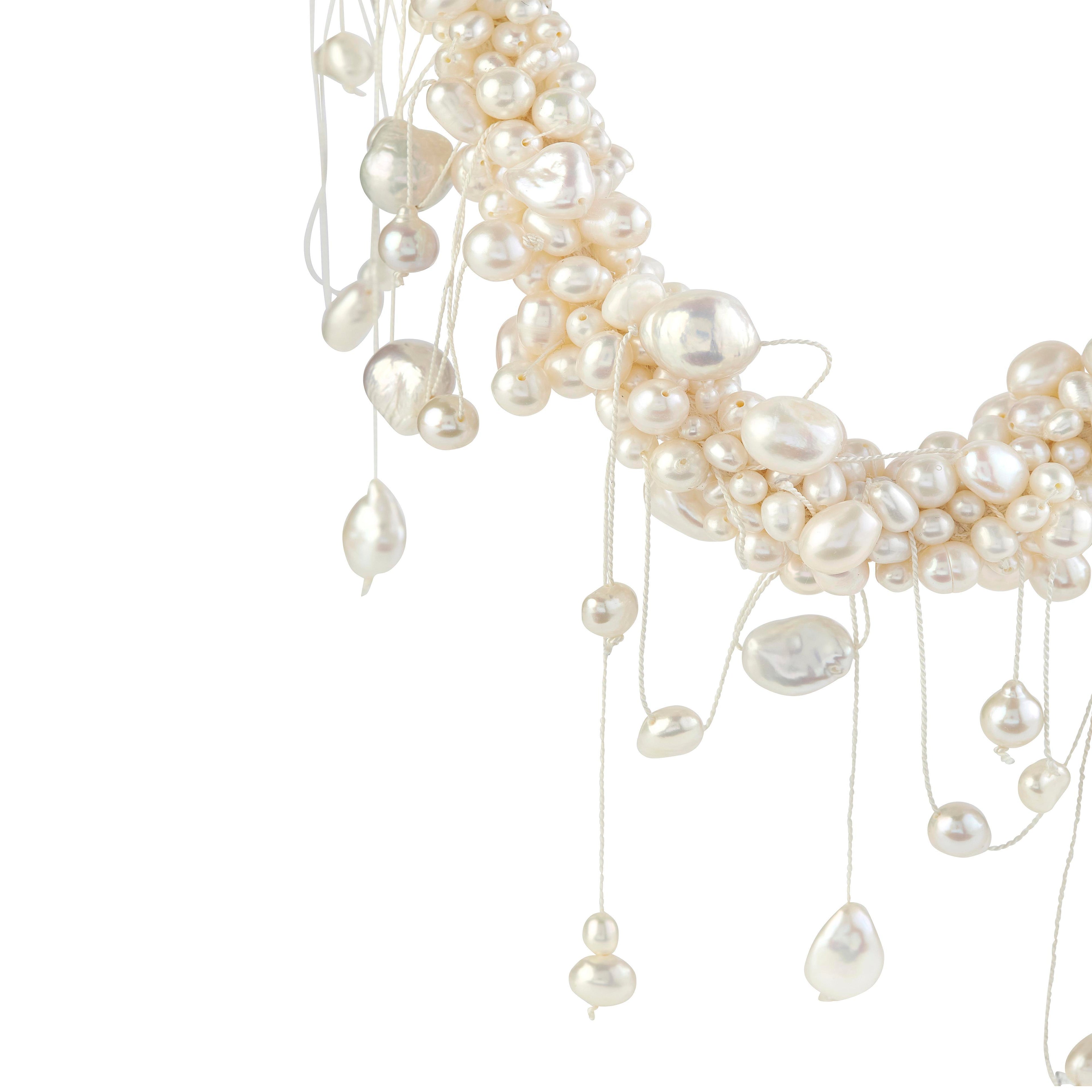 Hand strung baroque pearls dance through a twisted and tangled pearl choker cascading delicately across the neck