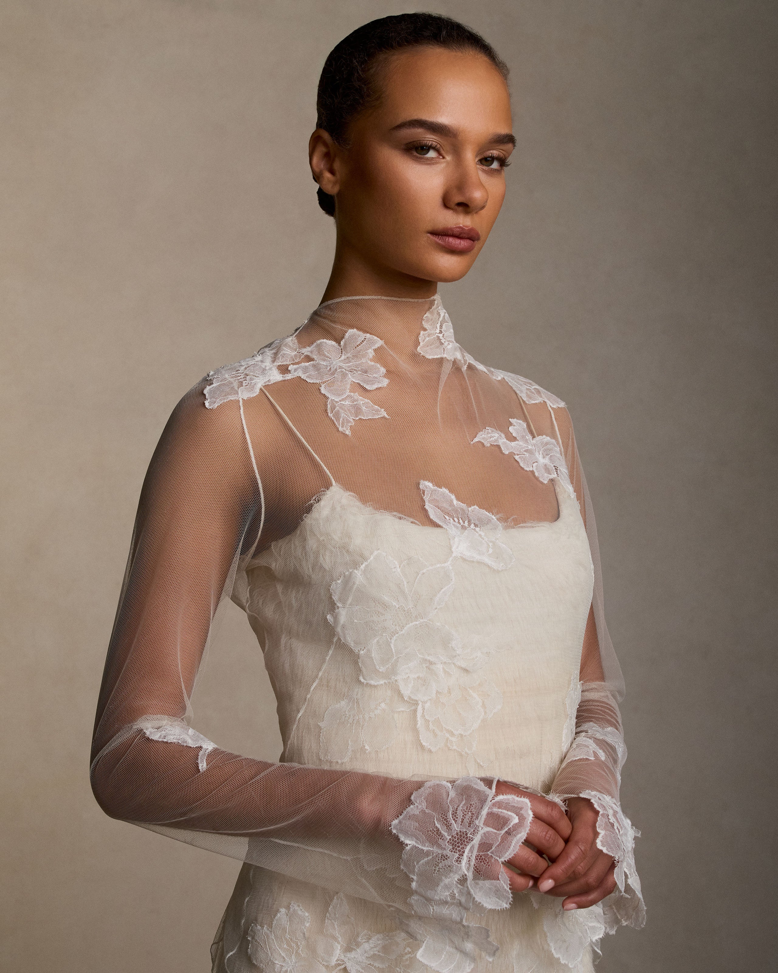 Veiled tulle mock neck topper with hand cut lace appliqué. Open back, split wrist, and delicate single tie at neck to close