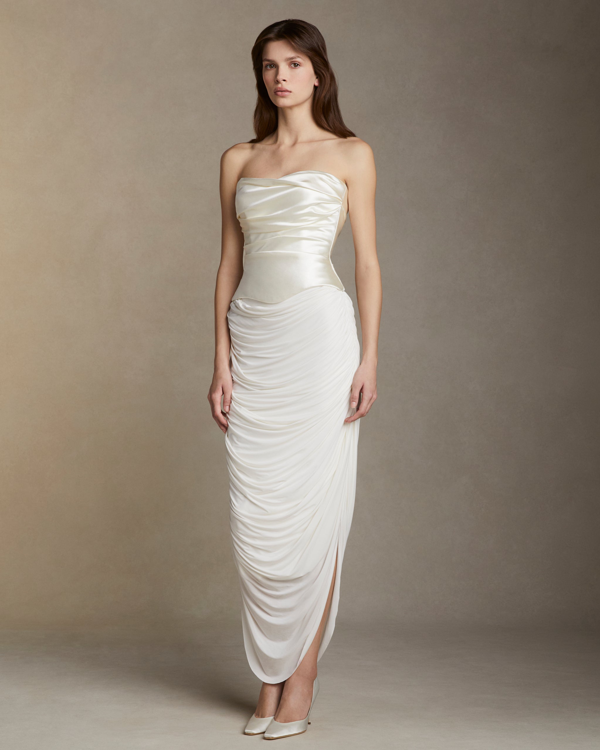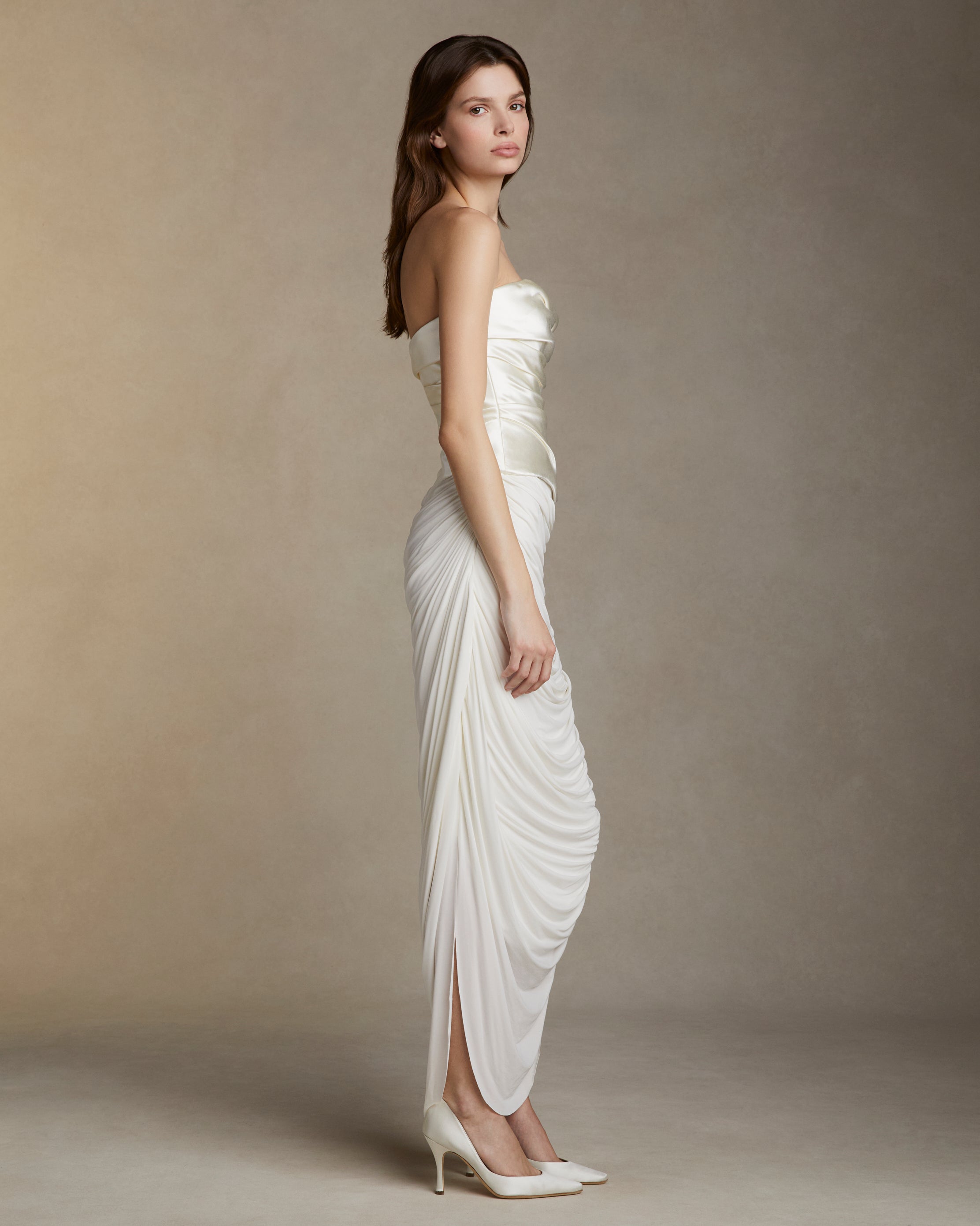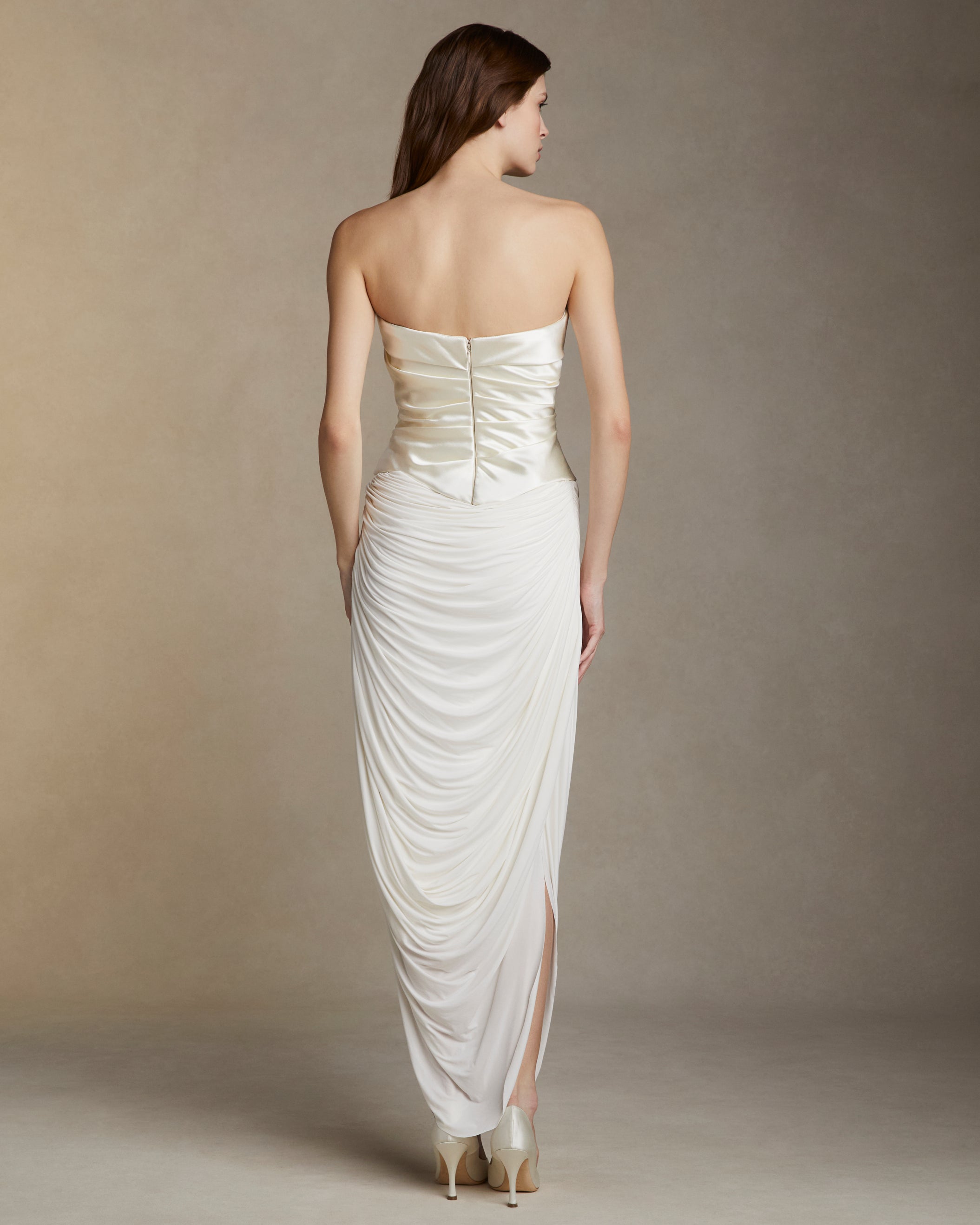 Silk wool strapless draped bodice with soft basque waistline. Invisible zip closure at center back.