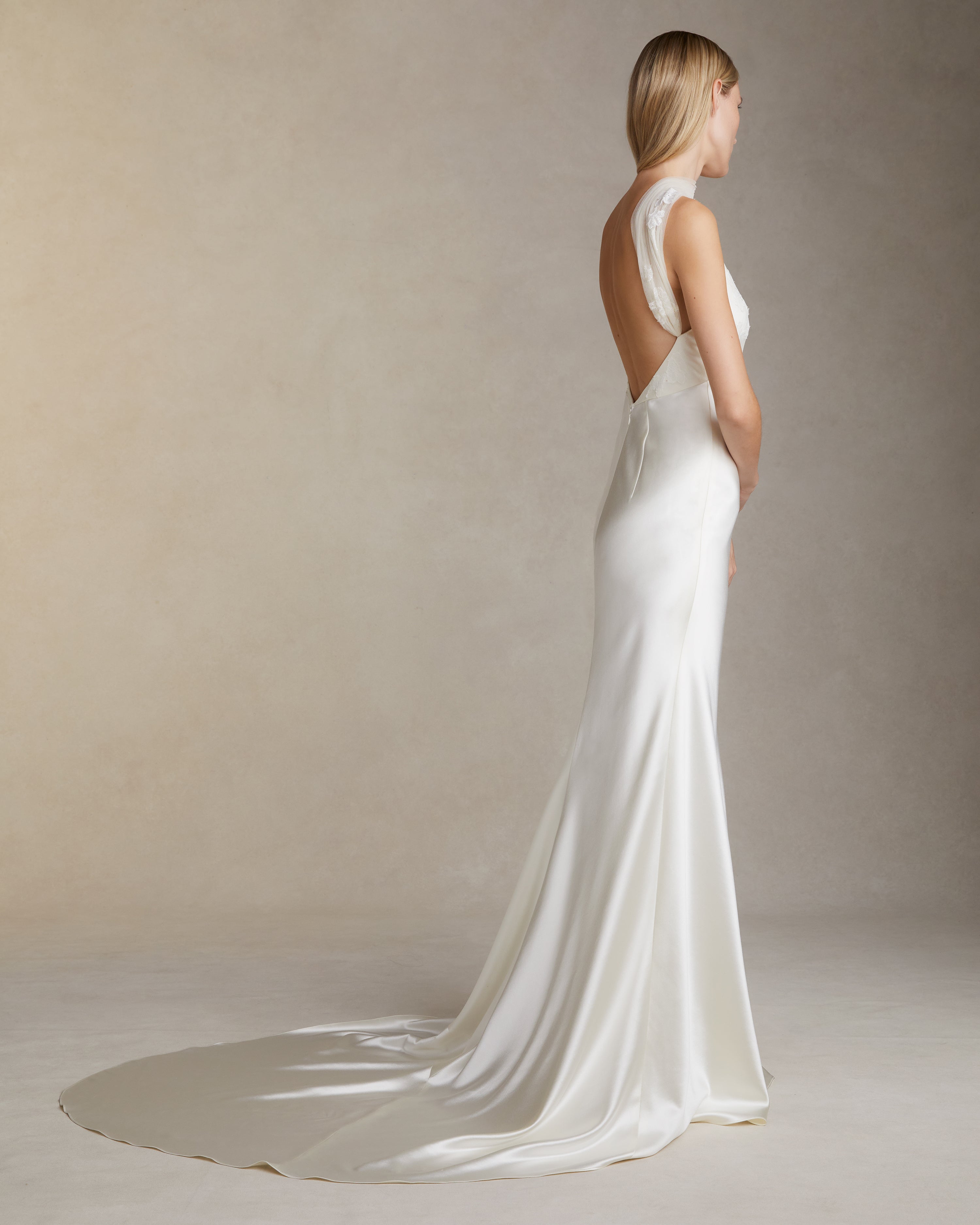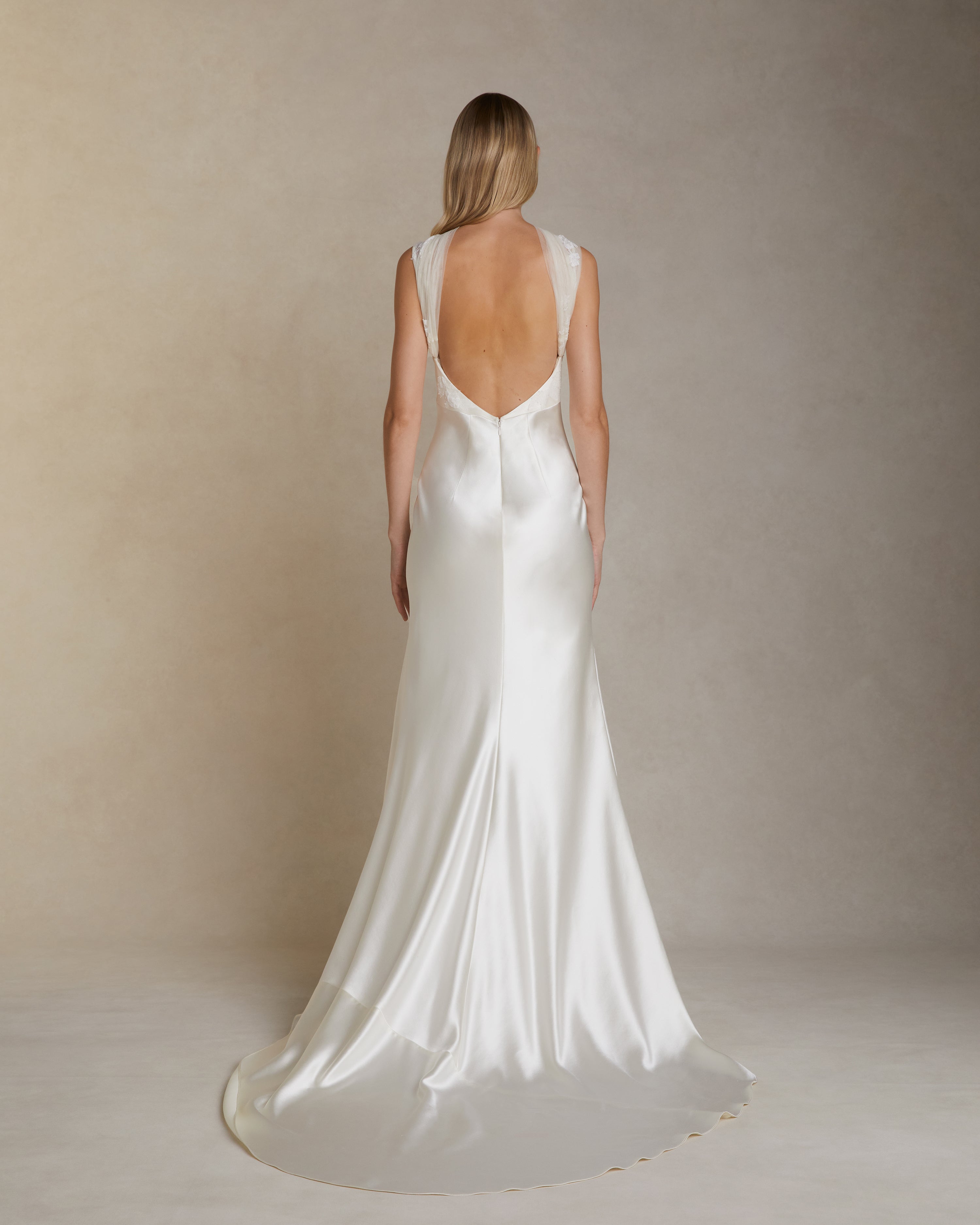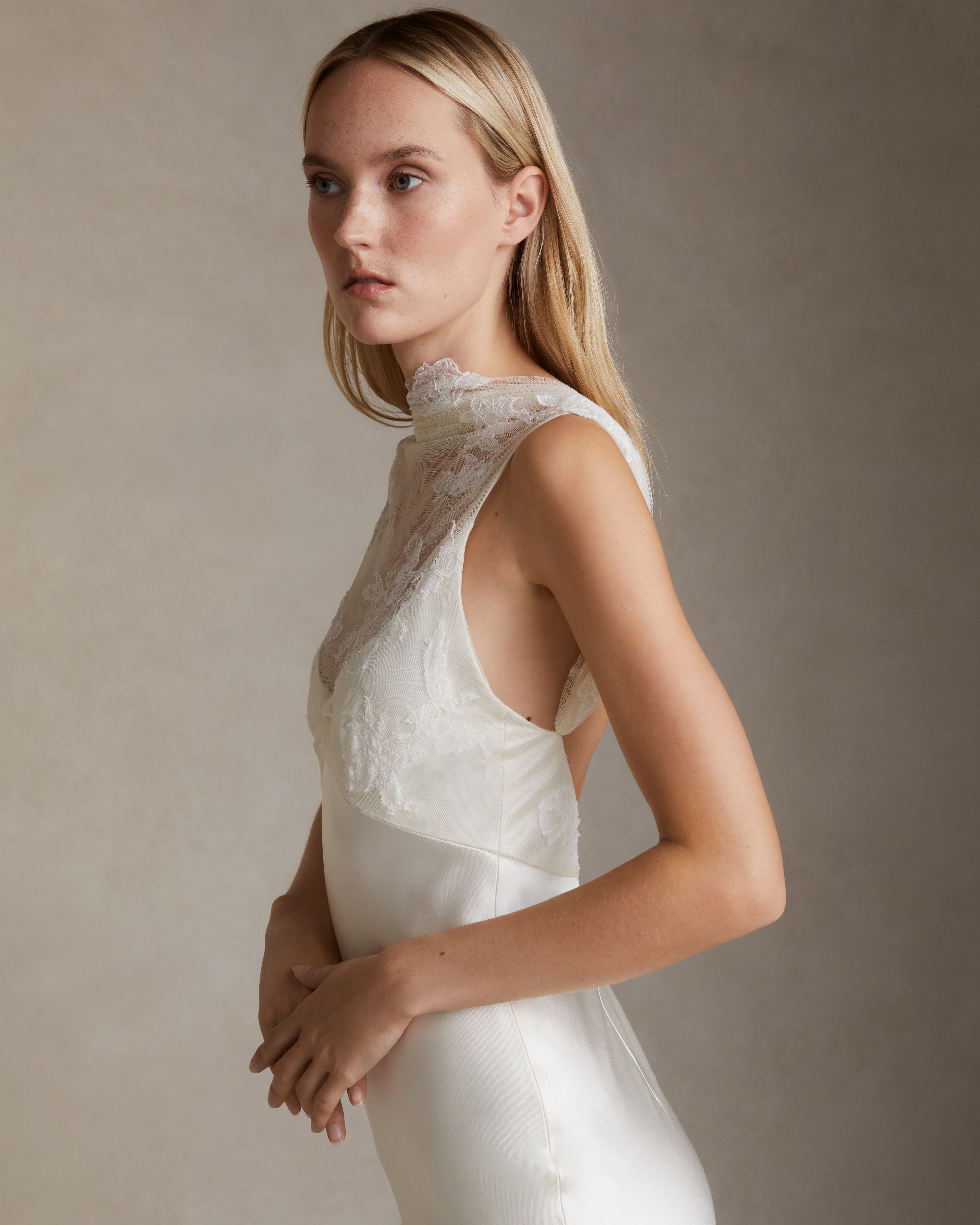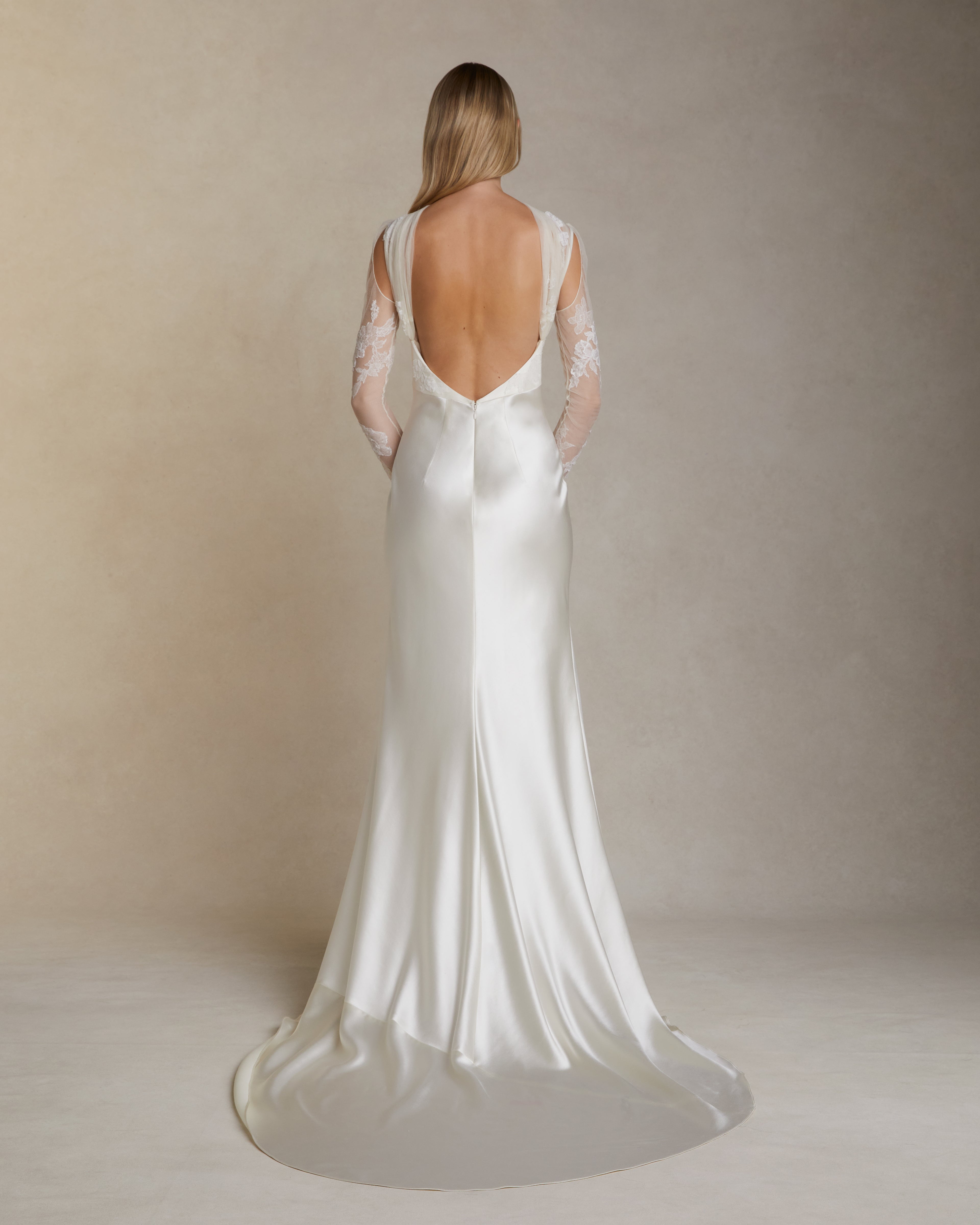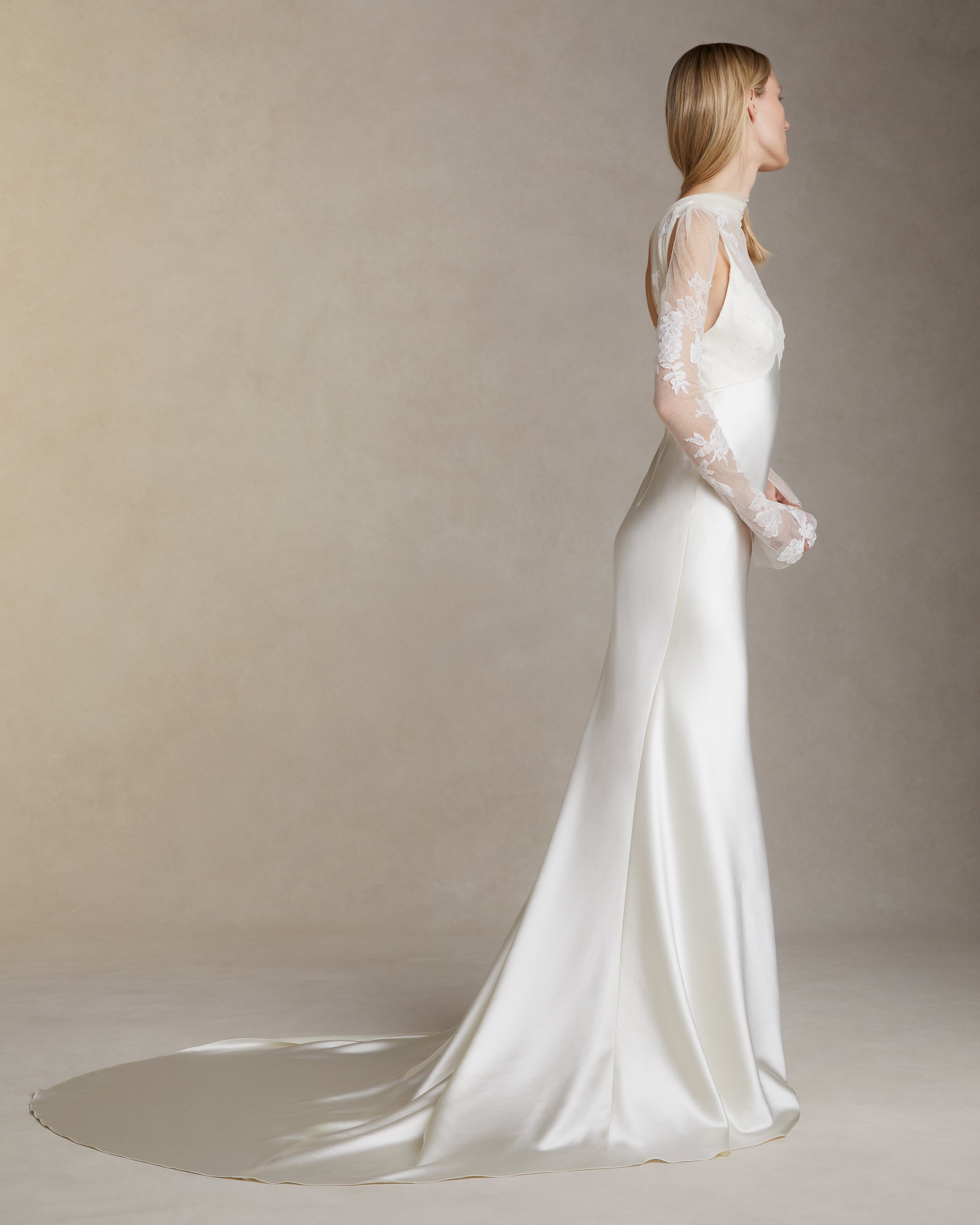 Silk wool slip gown with long sleeve tulle overlay bodice decorated in hand cut corded and chantilly lace applique. Removable sleeves and invisible zip closure at center back. Available without sleeves for $5790