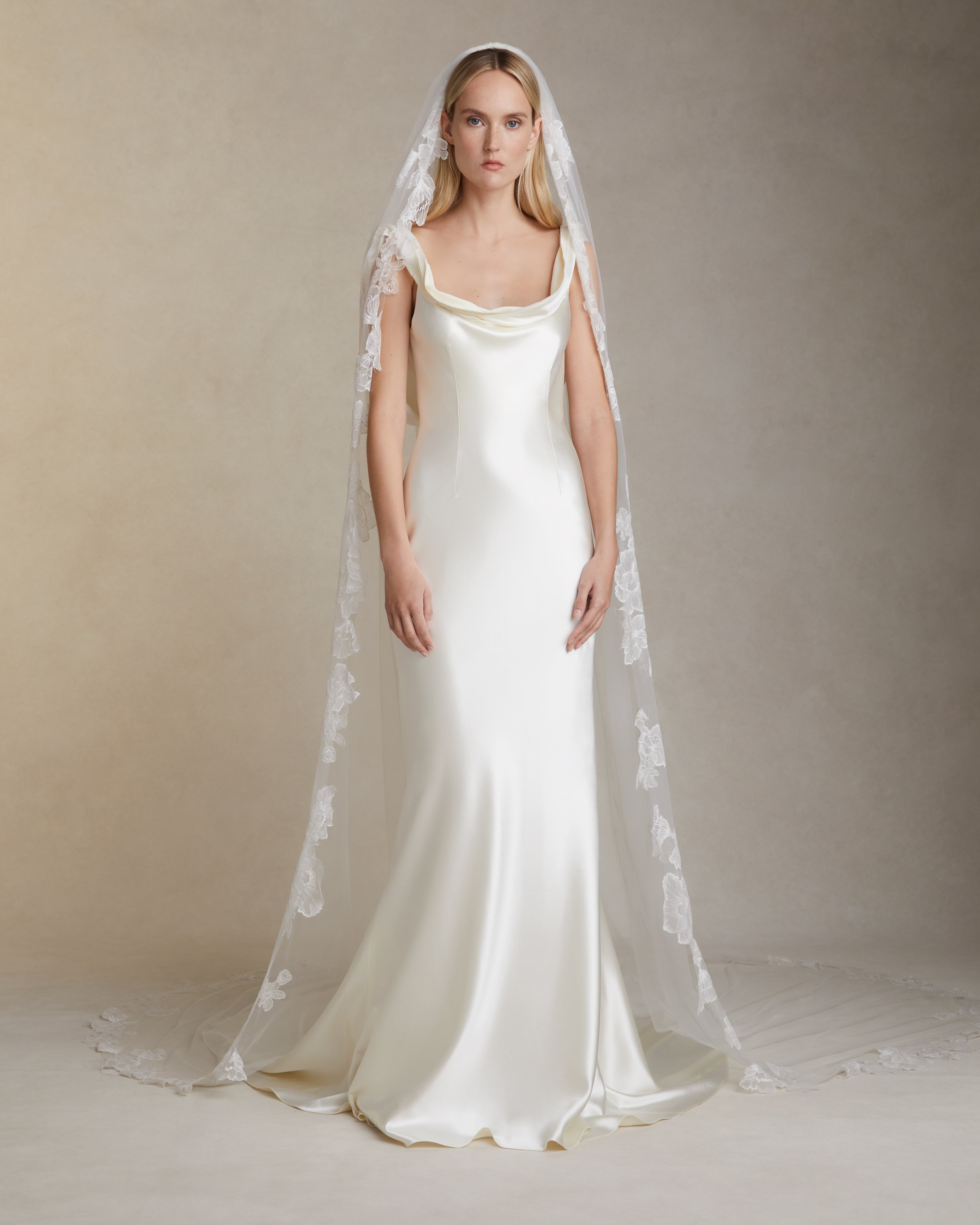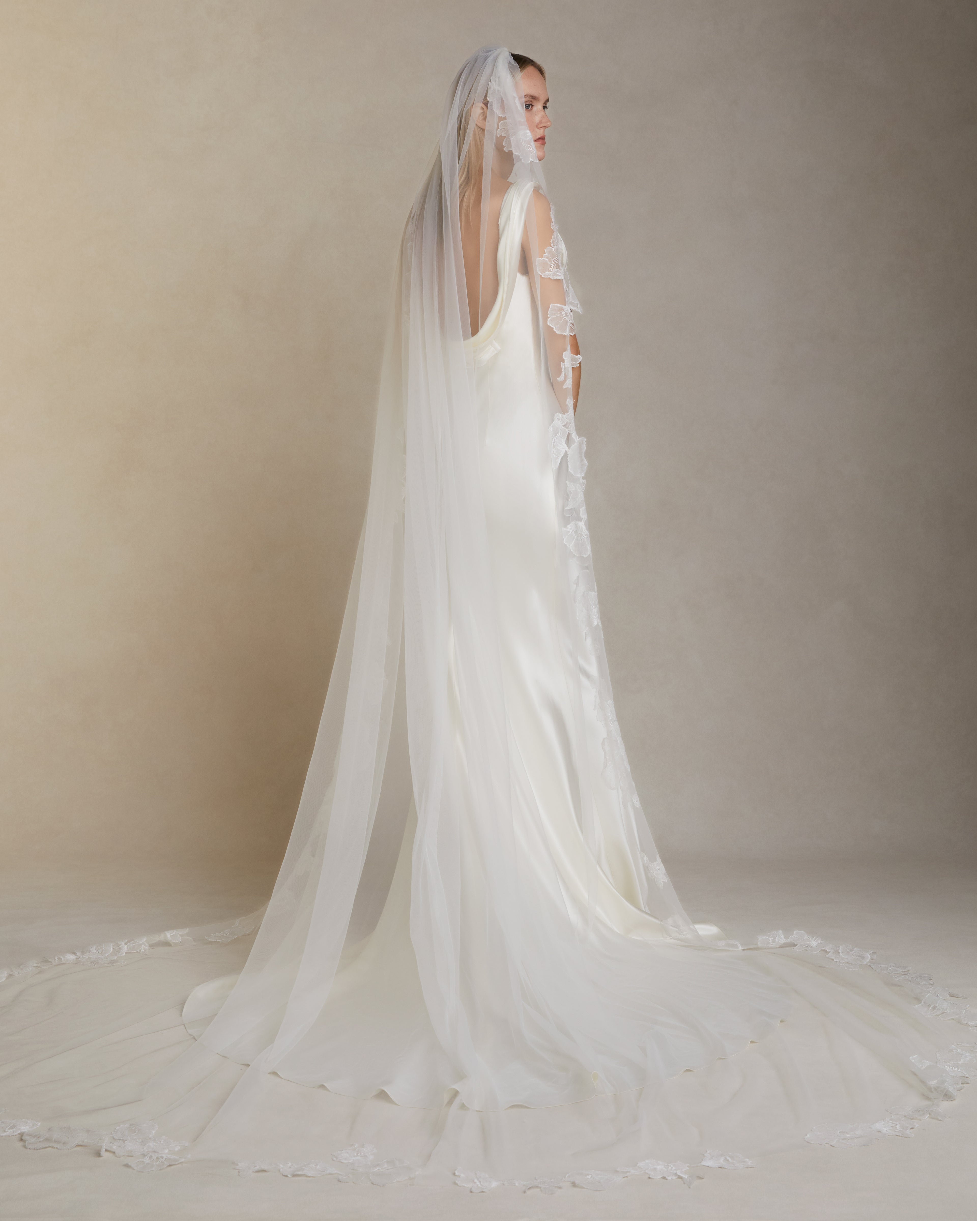 Tulle veil with hand cut lace appliqué border. Tulle is gathered at comb and extends 114" from the comb to hem