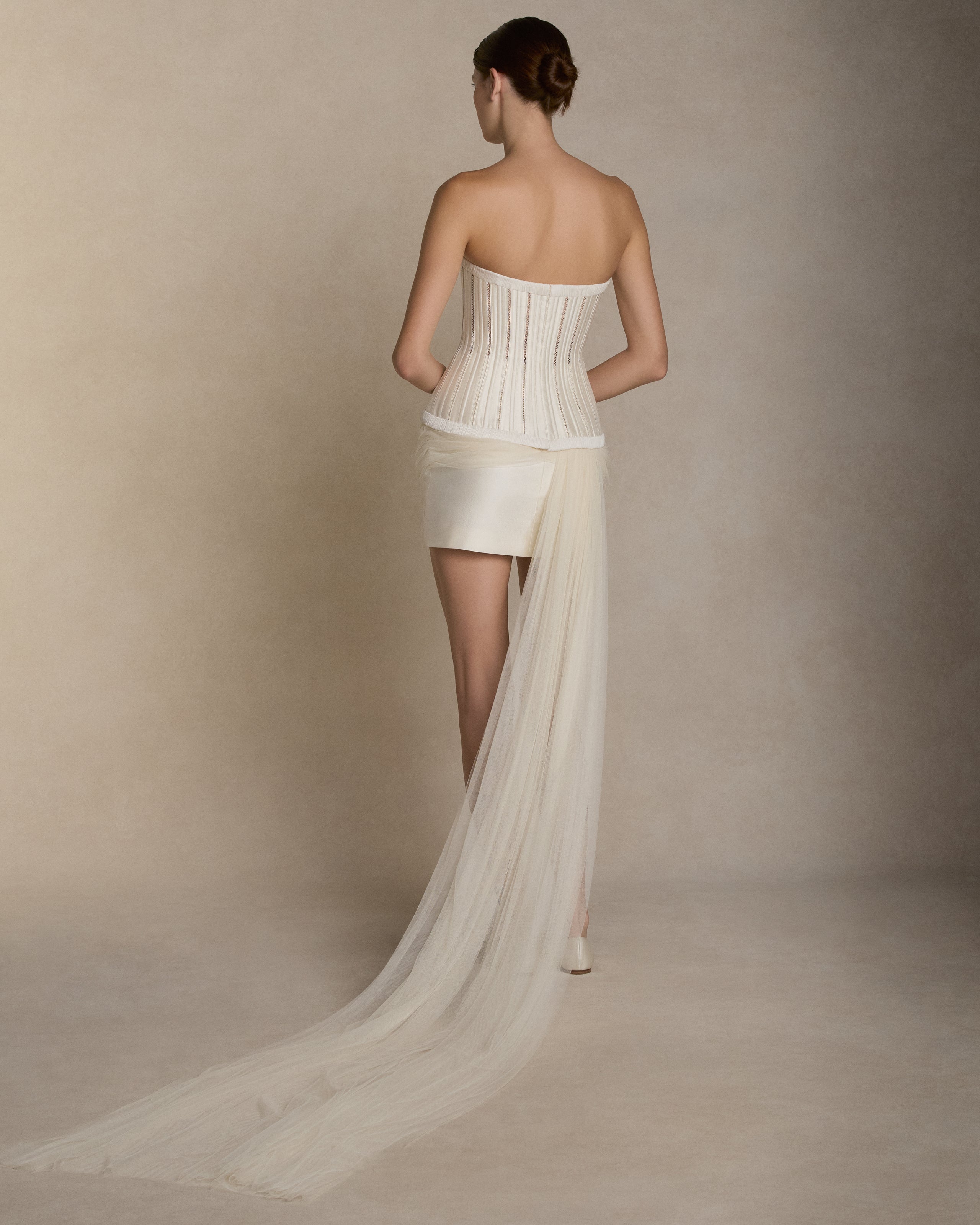 Silk wool twill boned bodice piped and picot lace trim detail. Neckline and waist are trimmed in plisse satin. Full hook and eye closure at back.