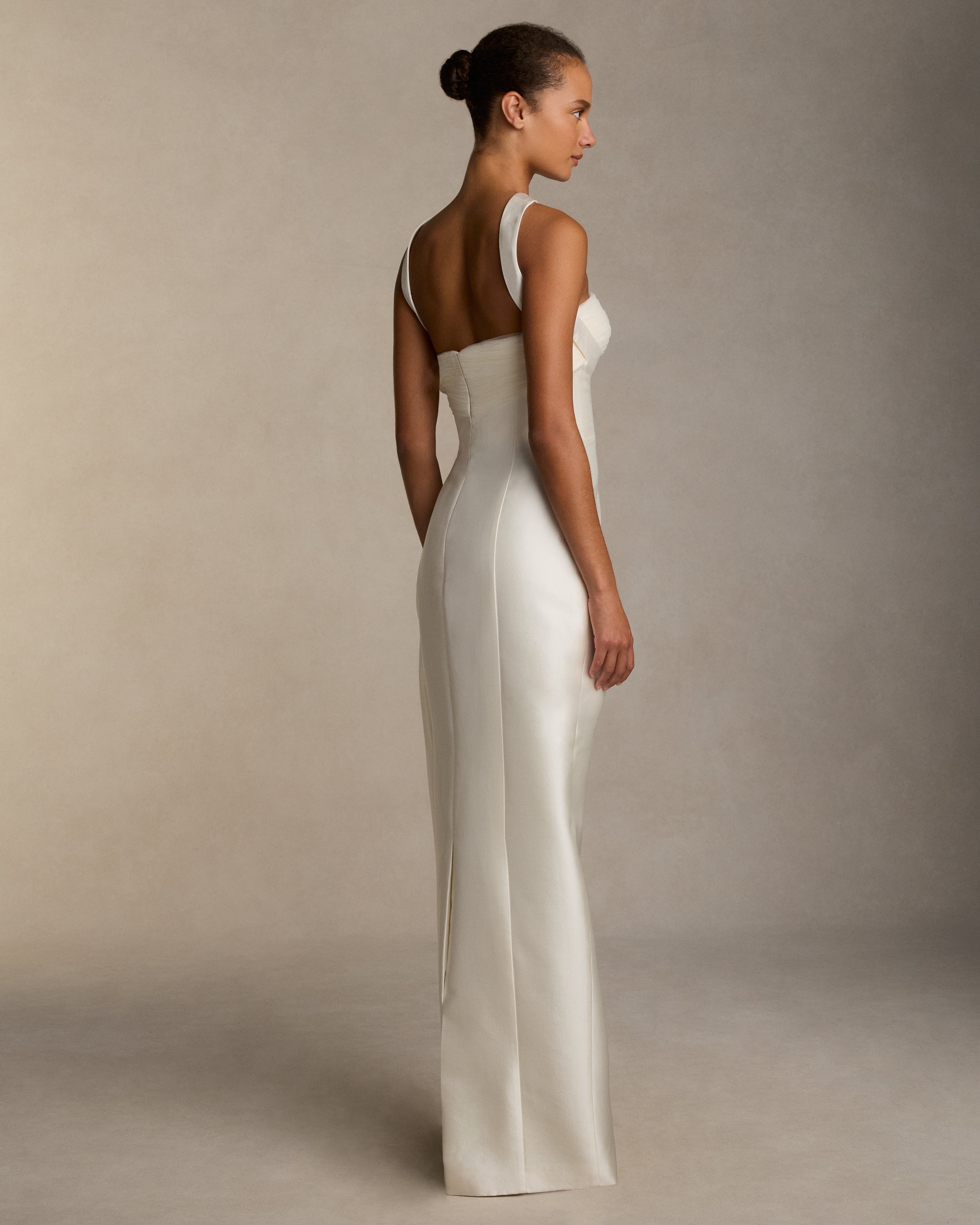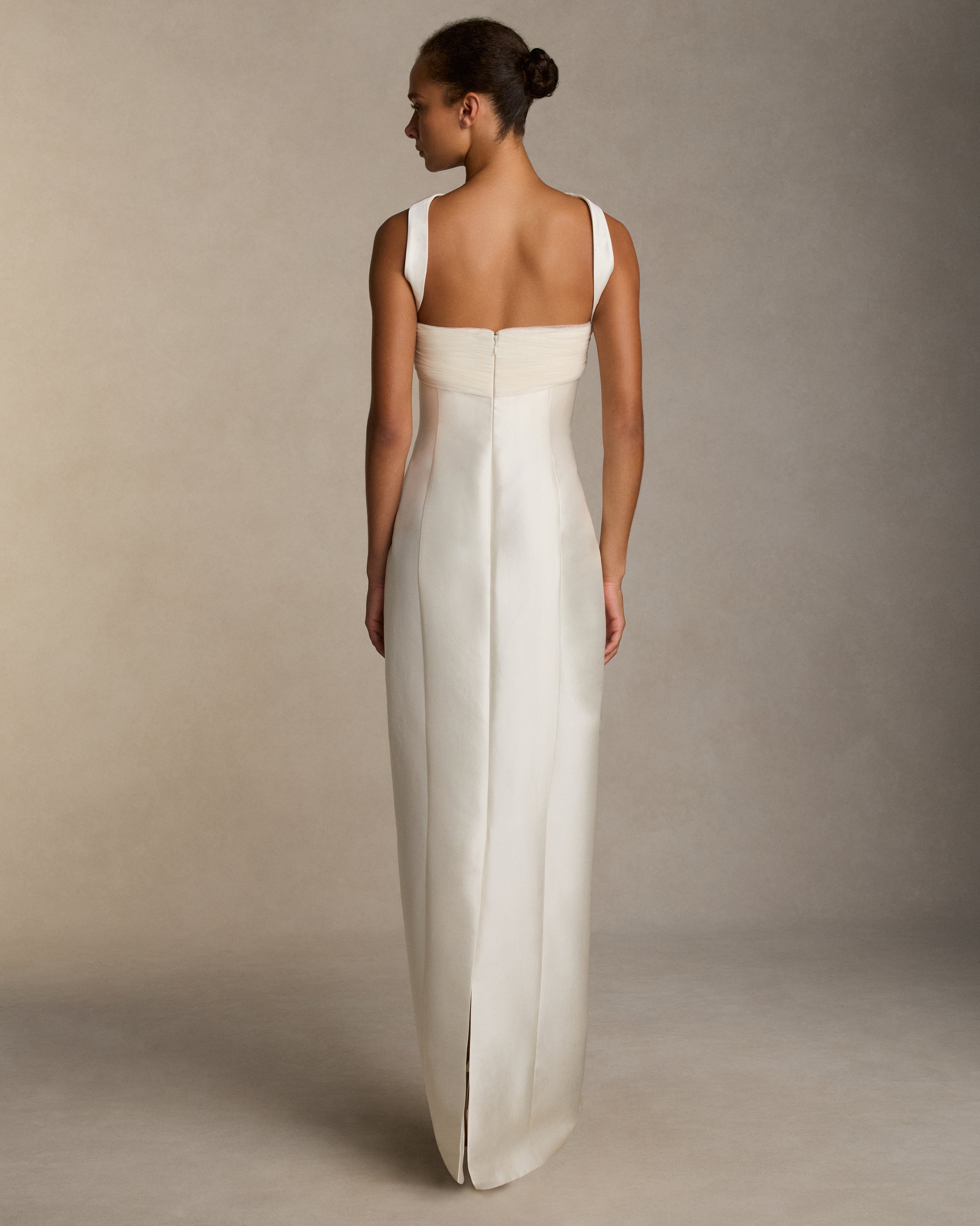Silk wool twill column gown with curved shaped seams and attached neck wrap detail. Gathered and draped tulle frames the bust wrapping towards the center back. Boned internal bustier, internal grosgrain belt and invisible zip closure at center back.