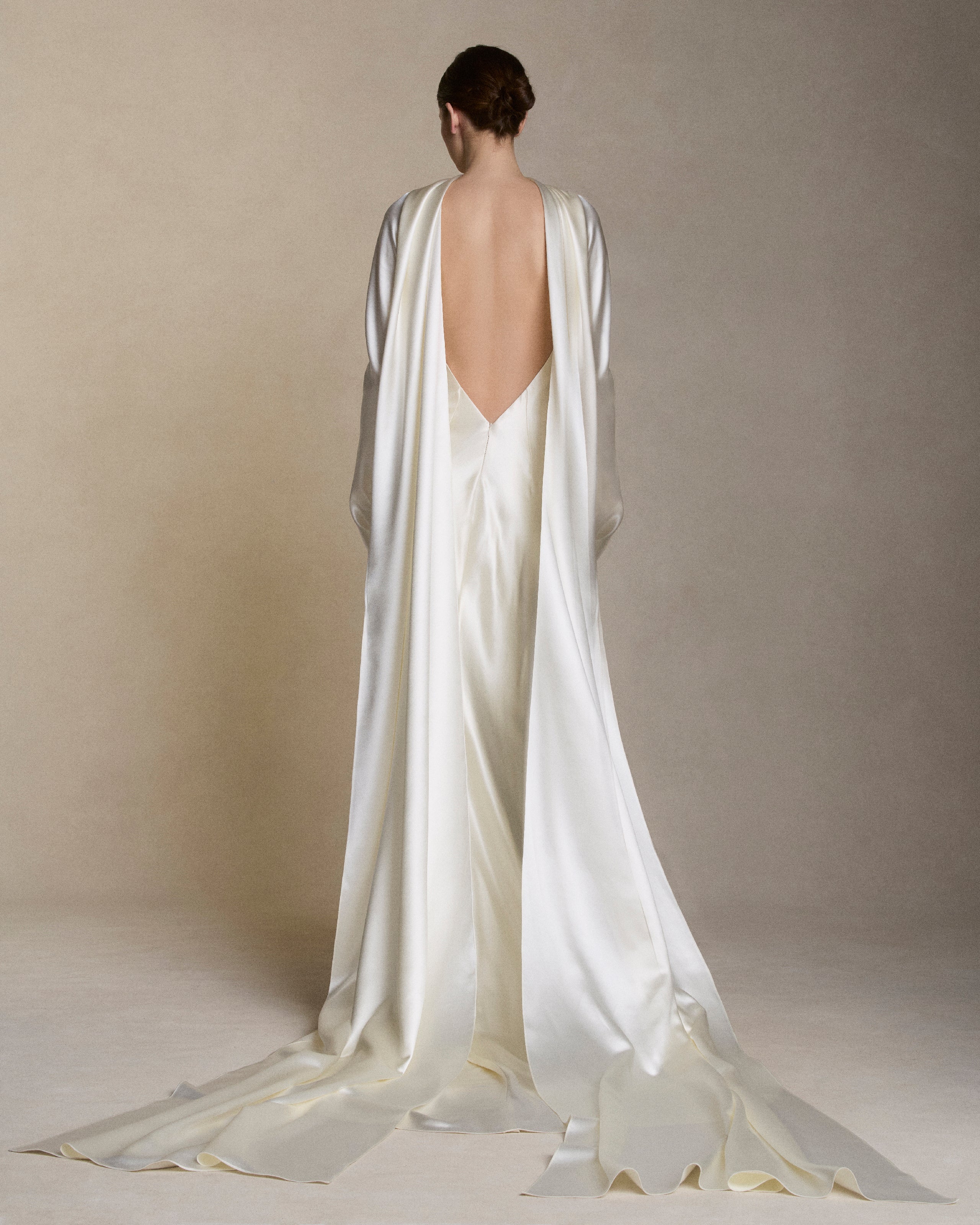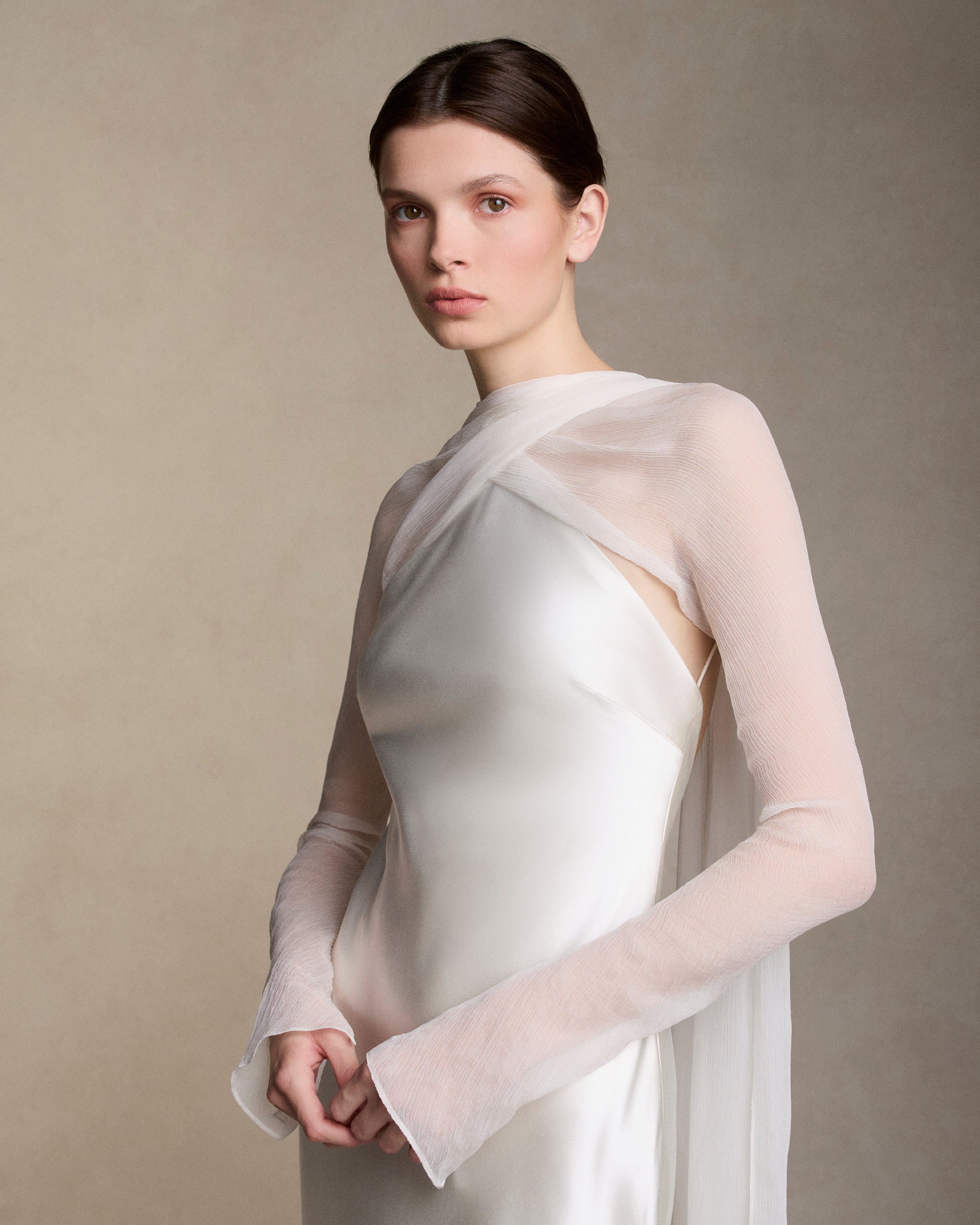 Silk wool bias cut slip gown with high angled neckline and spaghetti straps. Removable sleeves drape across center front falling into a scarf train detail at center back. Invisible zip closure at center back. Available sleeve fabrications: Silk Wool, Crinkle Chiffon, Tulle or Tulle with Appliqué Lace.