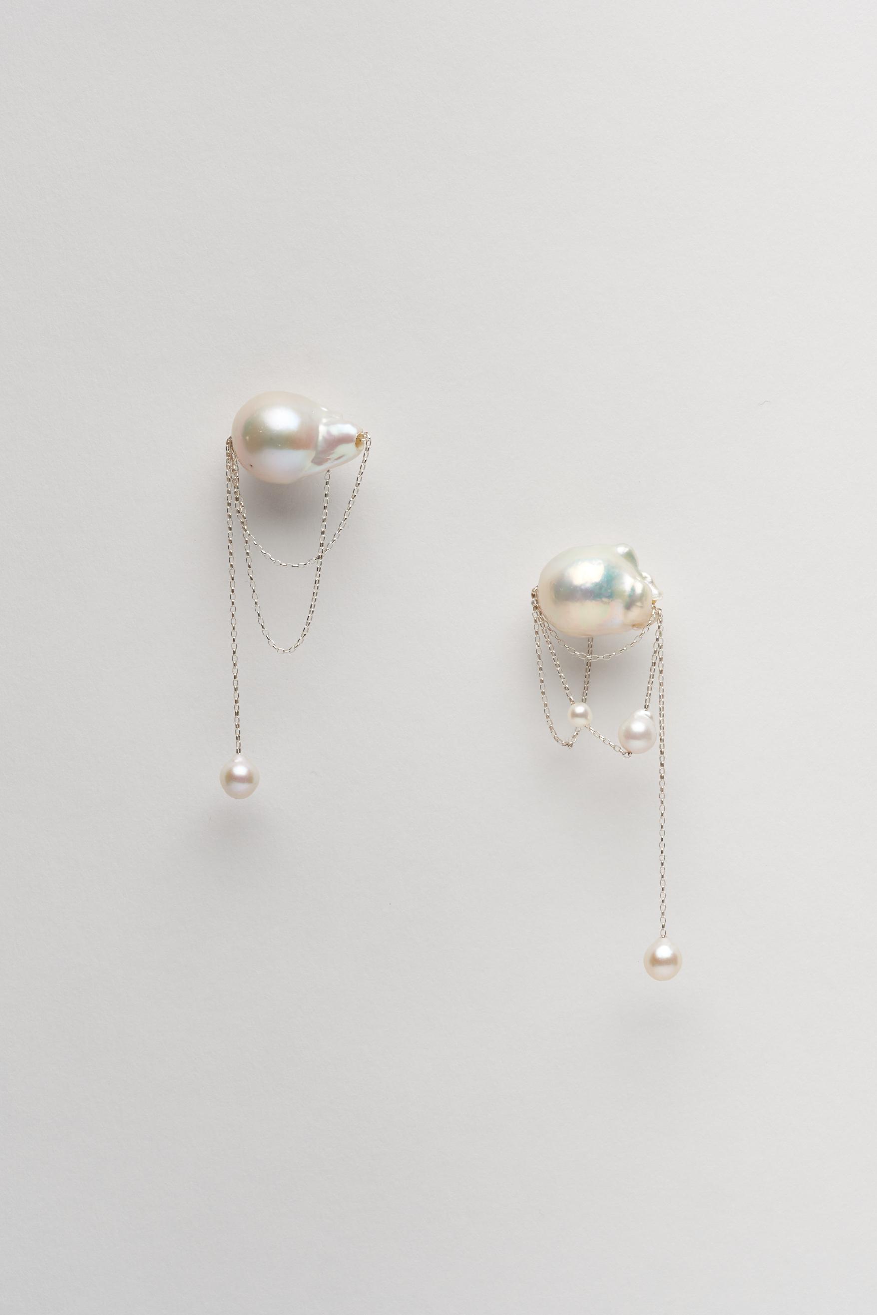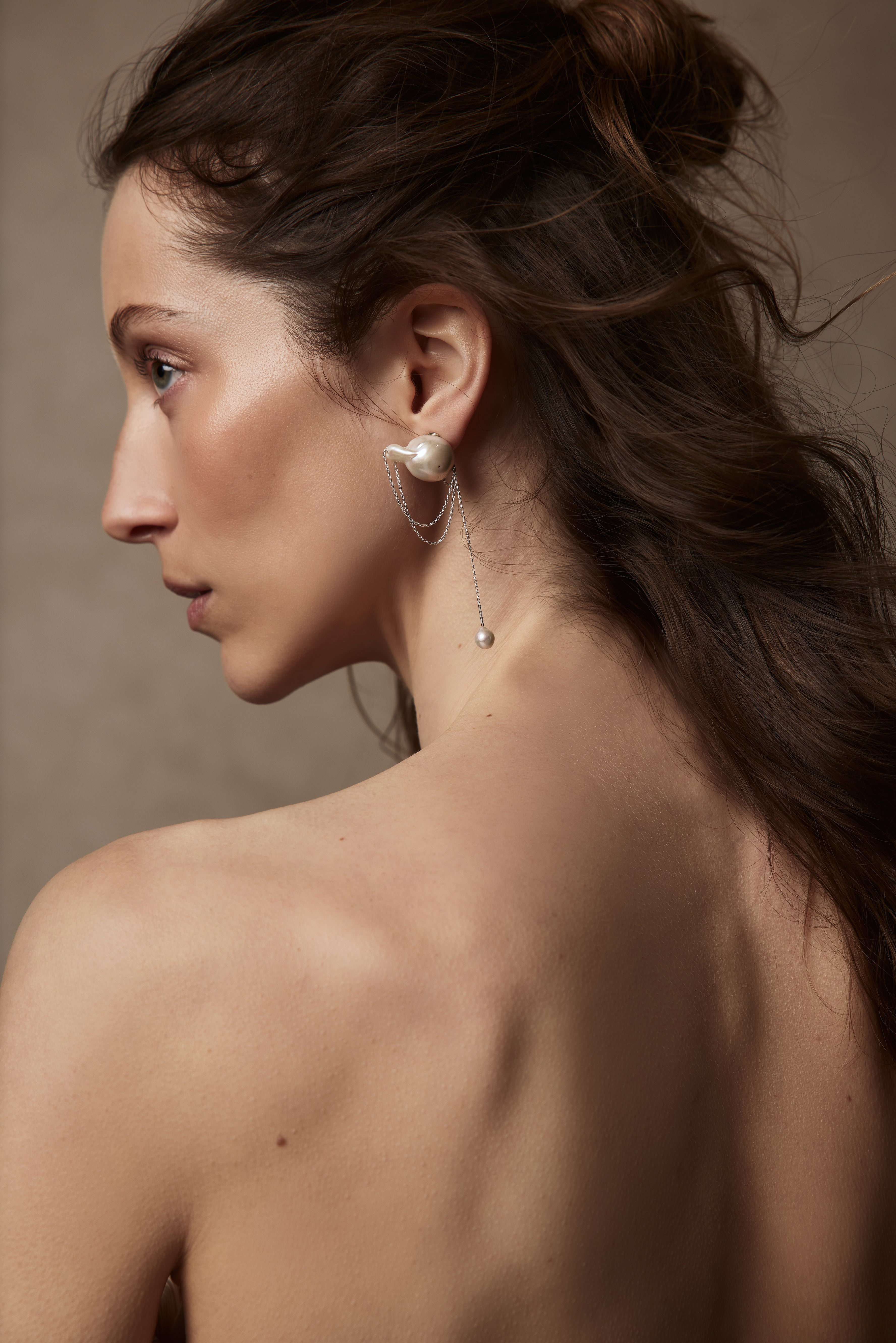 Swags of sterling silver chain decorated in delicate pearls thread through a baroque pearl stud earring.