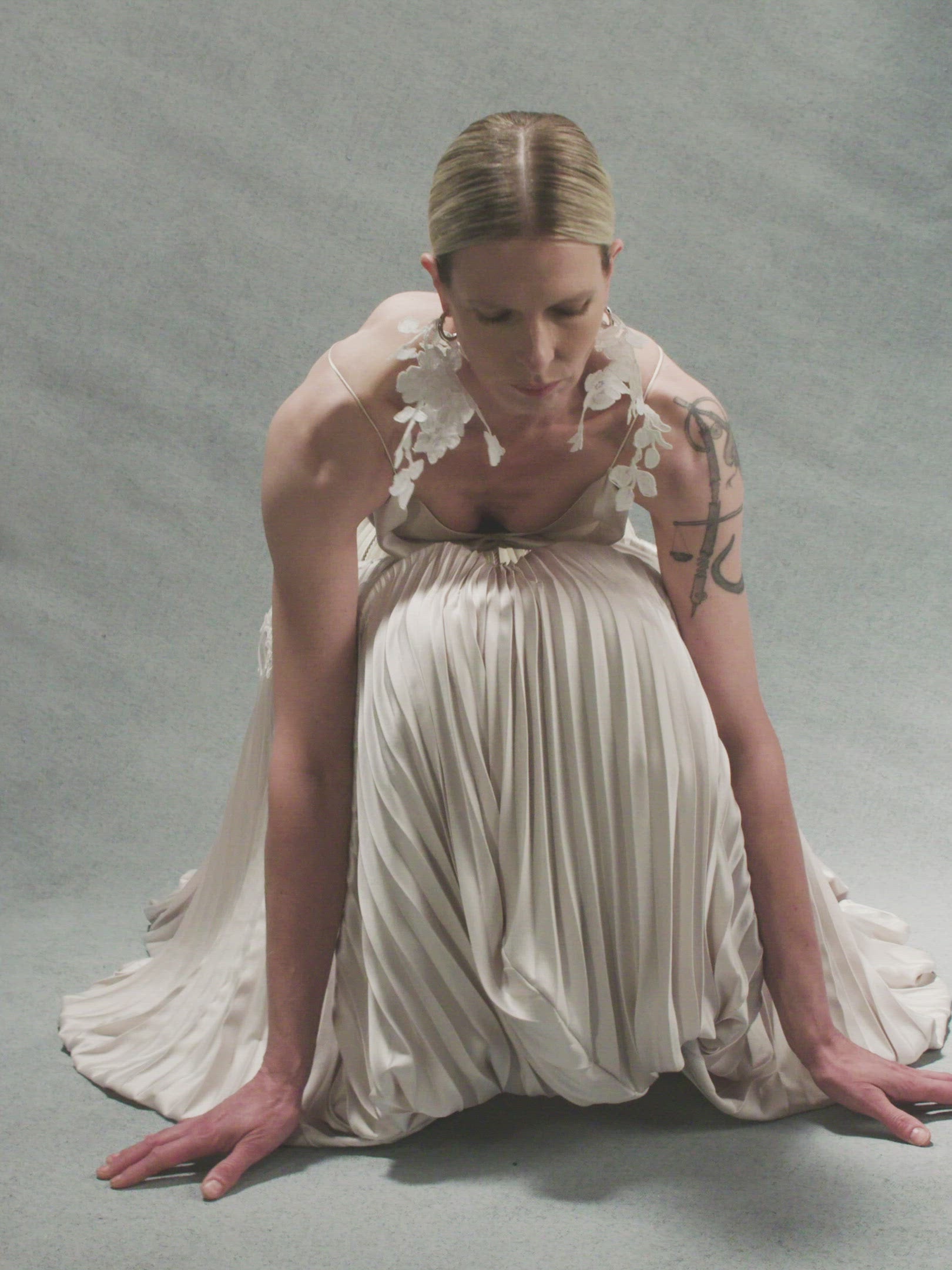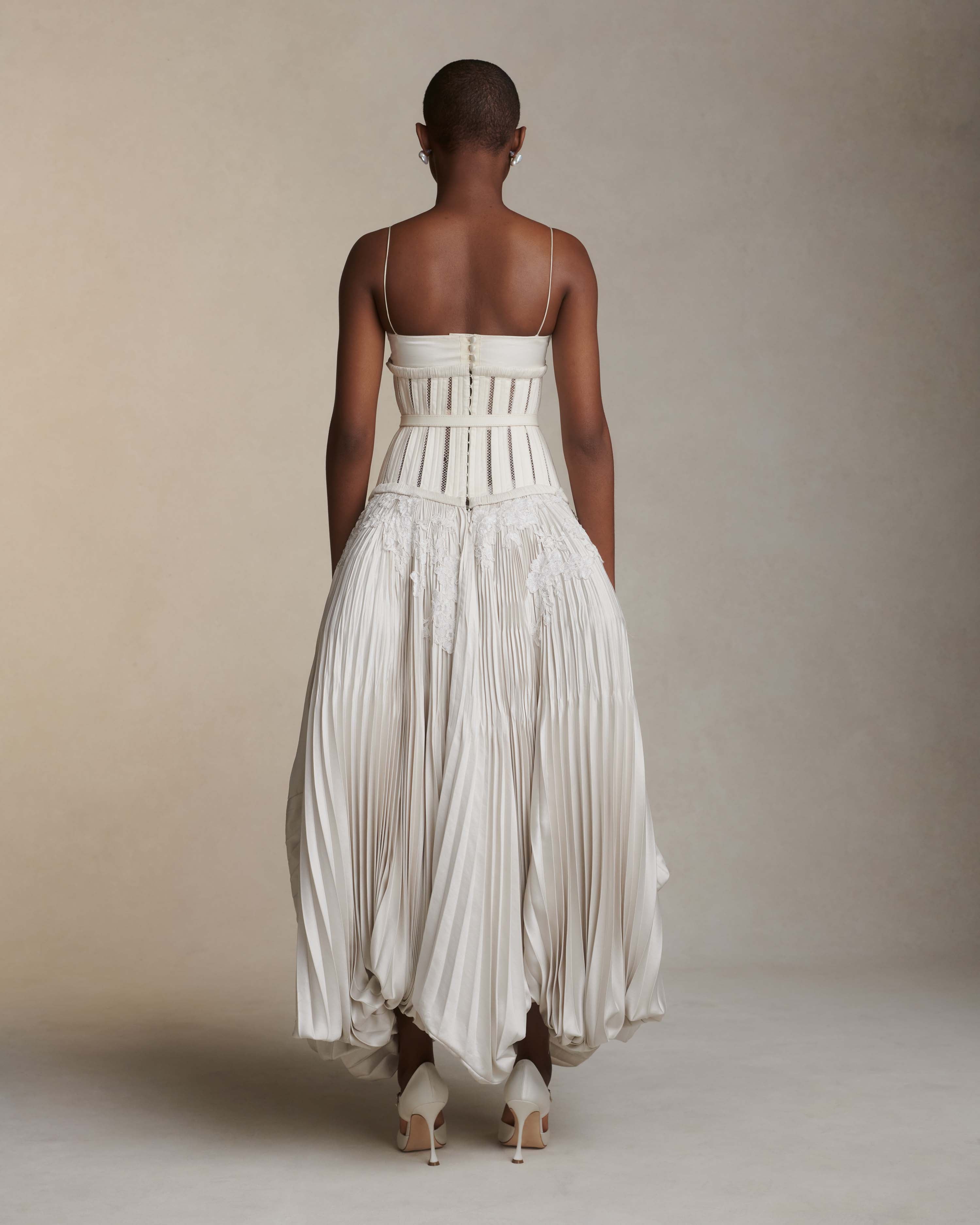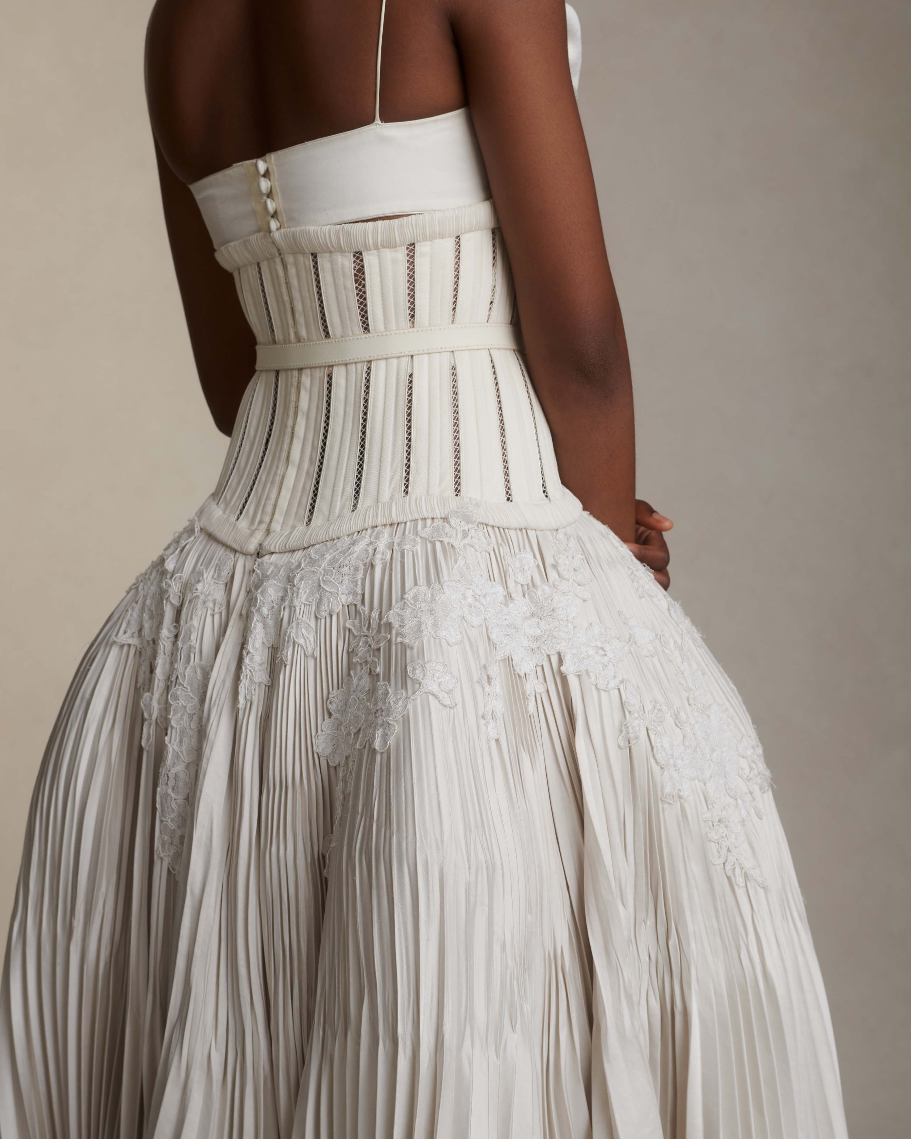 Skirt: Full corset with georgette trim and satin piping at seams attached to umbrella pleated skirt accented with hand cut corded lace. Hook and eye closure down center back, zipper at skirt layered over internal grosgrain waistband with three hook and bar positions. Skirt lined in organza and can can ruffle for interior construction and shaping.