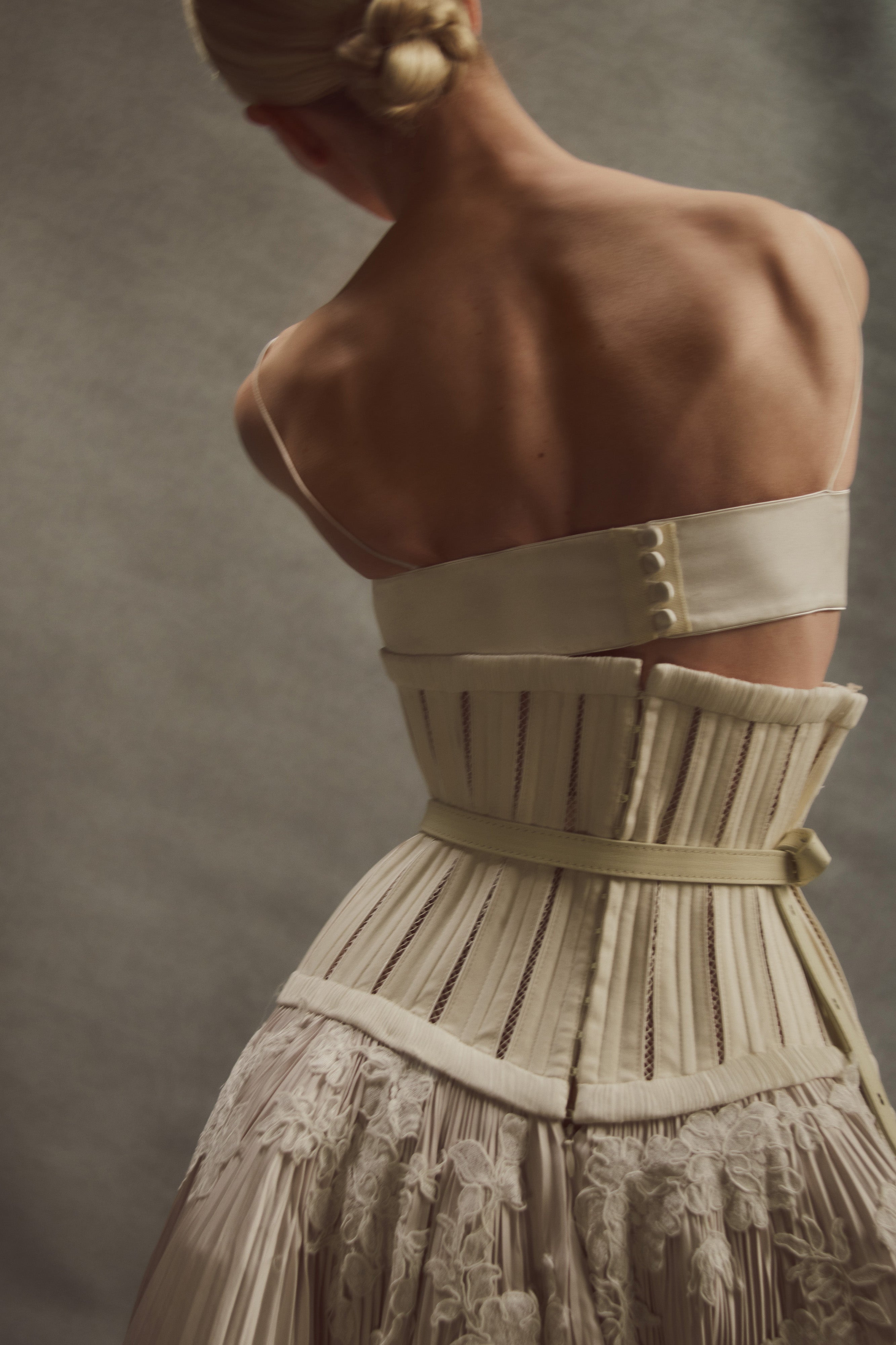 Bra: Fully structured, draped satin twill front with hand cut, hand applied corded lace with internal cups, grosgrain and four button loop closure at center back.