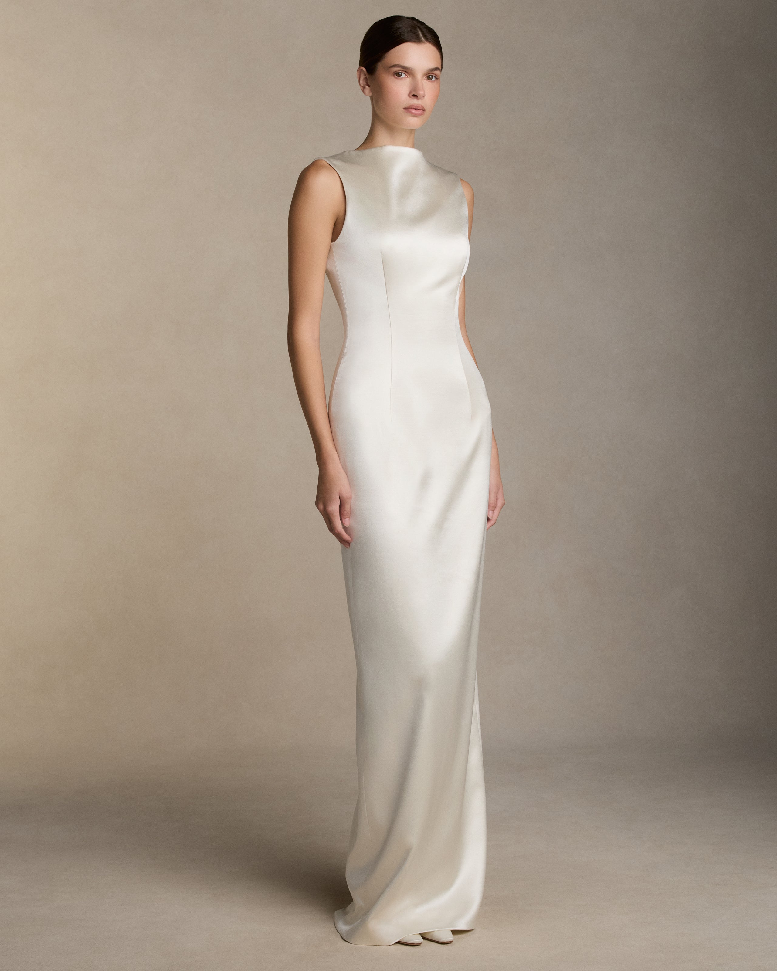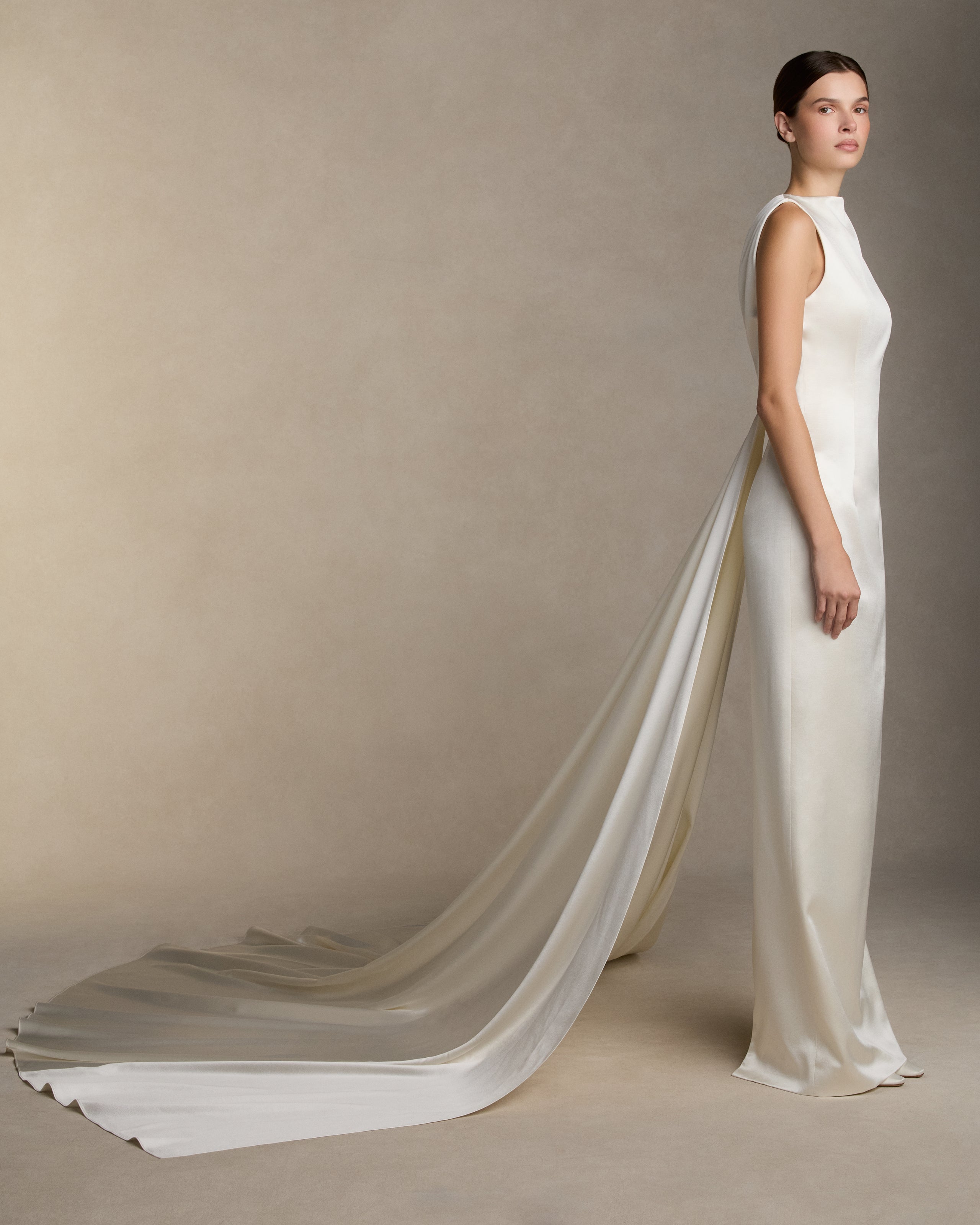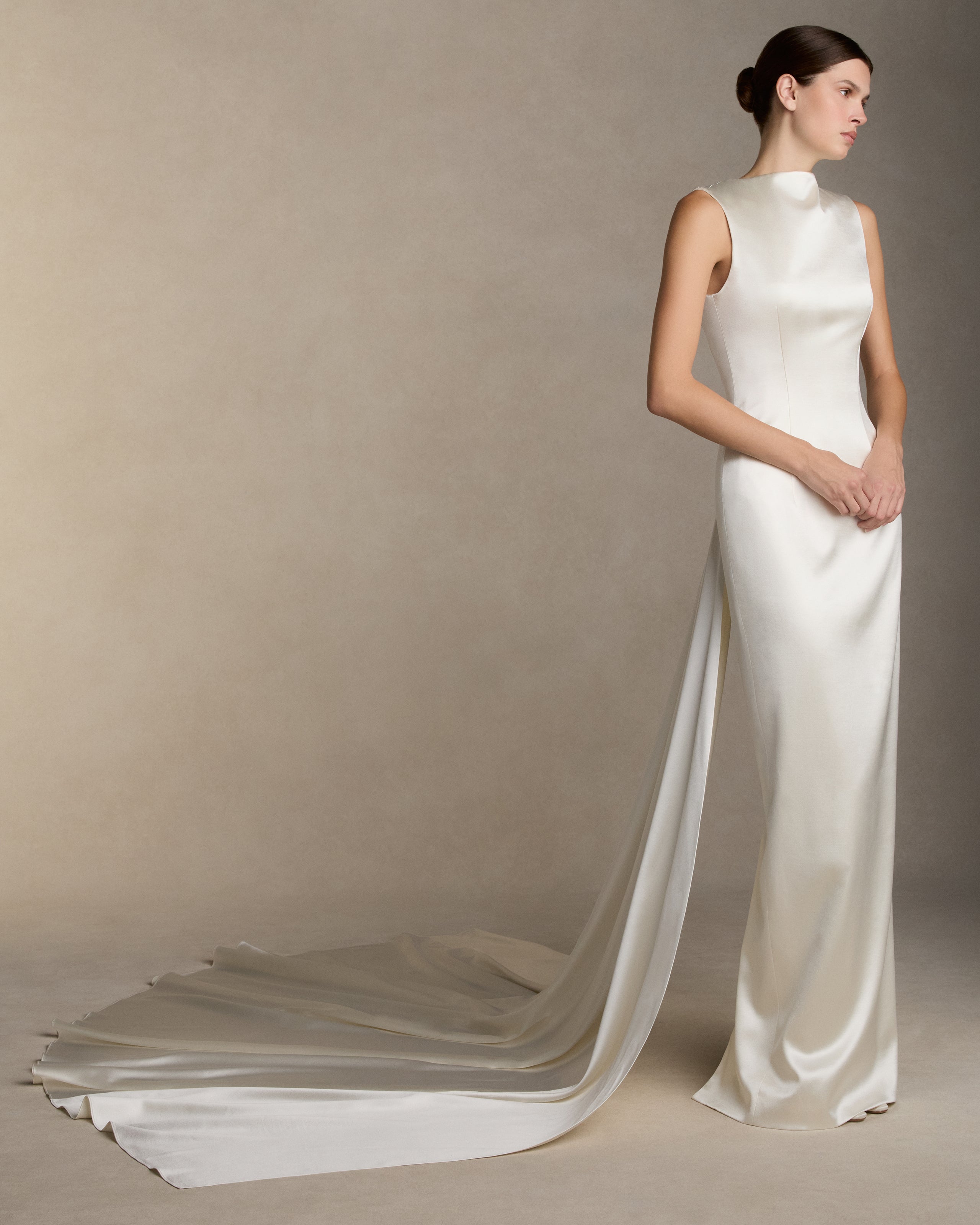 Silk wool column gown with high neckline and deep V back, featuring covered buttons down center back and back slit detail on skirt. Removable watteau train detail is suspended from the back neckline. Invisible zip closure at center back.